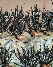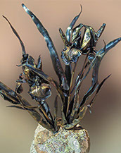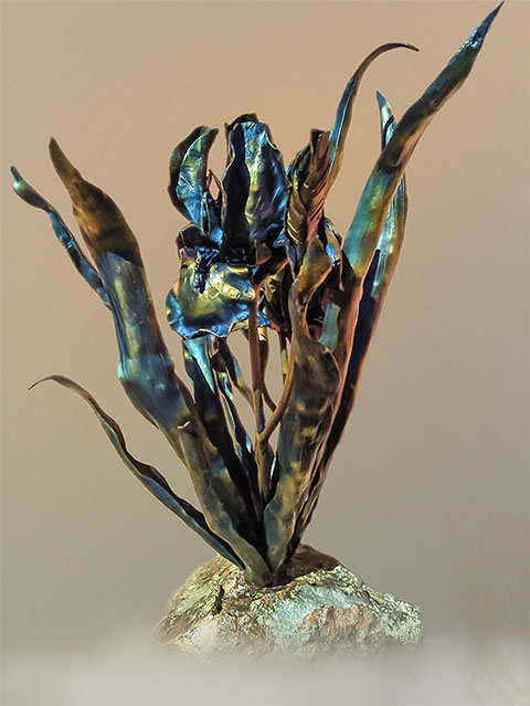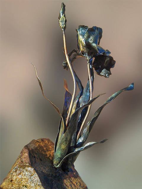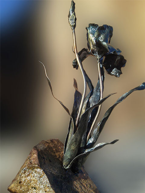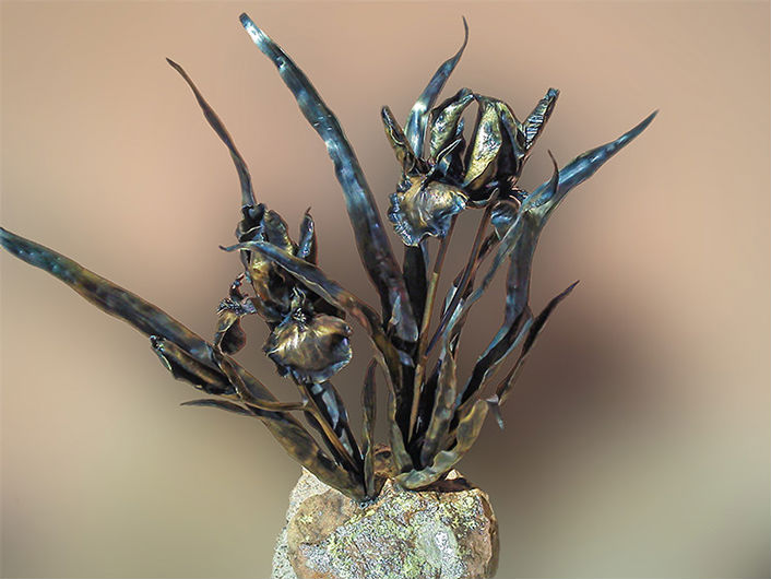 Each Iris is hand made from metal that has been forge heated and hammered into the desired shape. The base is a rock that I found somewhere along my daily spiritual walks. I hope you enjoy this rough creation as much as I enjoyed creating it.