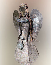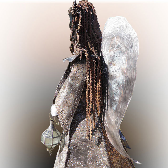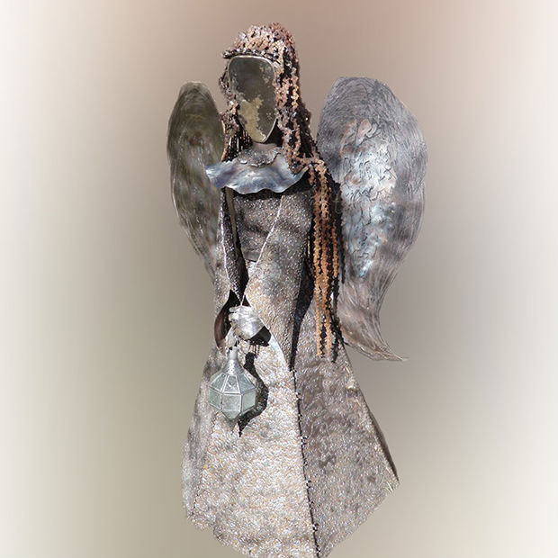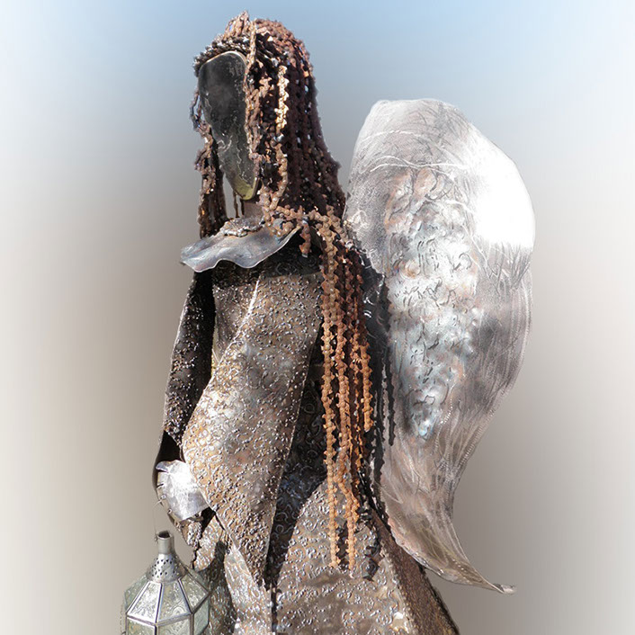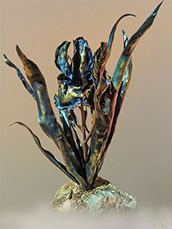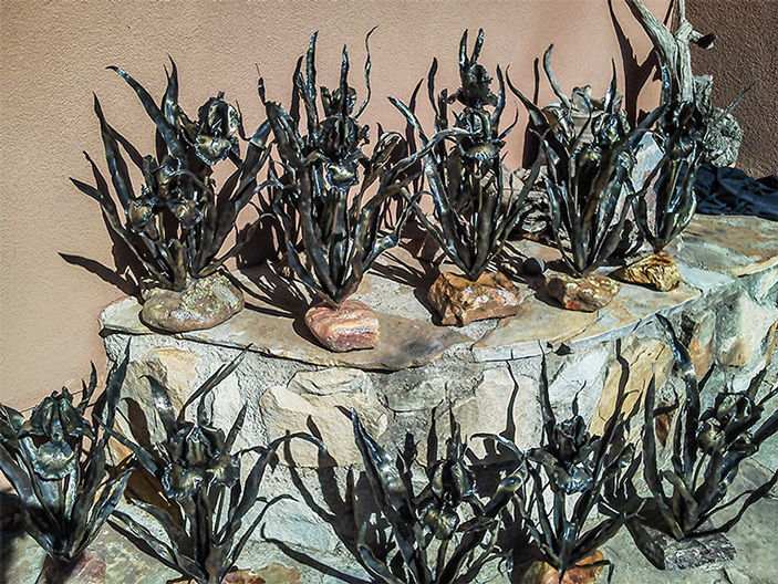 In the Spring of the 2011 Fire Season, I found myself waiting around in the Bonito Fire District for wild land fire calls. I started experimenting in Carl’s metal shop with discarded pieces of metal to pass the time. Soon, metal Angels emerged from the rusty metal, Then, a close friend asked me to create a gate for her patio. So, with Carl’s help a gate was created. In the design of the gate were some blooming Iris flowers. My friend wanted the Iris to be three dimensional. I had made three dimensional flowers out of Gum Paste, (a form of sugar art ) for many years , while I was in the cake business. Soon, I’m learning how to use Carl’s cutting torch, plasma cutter and welder!!! After struggling with heating the metal with Carl’s cutting torch, Carl suggested that I learn to use his antique 1800’s model blacksmithing hand crank forge! So, a new way to create the Iris came along. It wasn’t long before Carl had me in Blacksmithing classes and Carl was building new and improved forges for me to use.