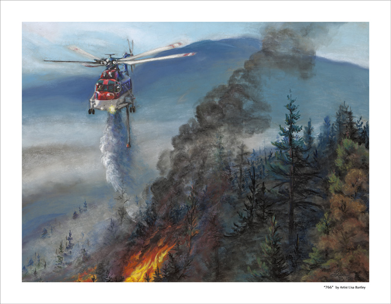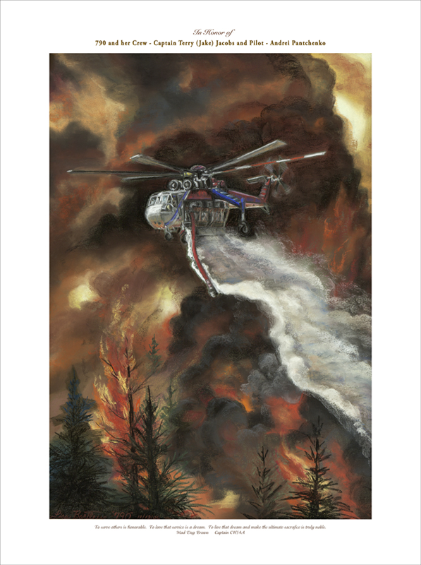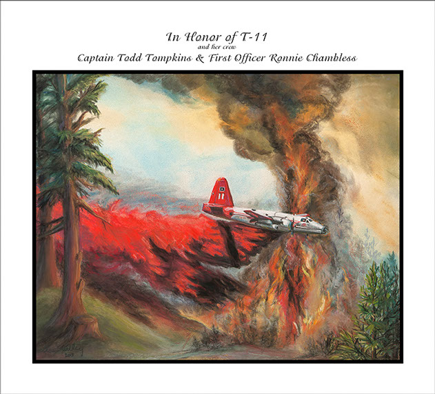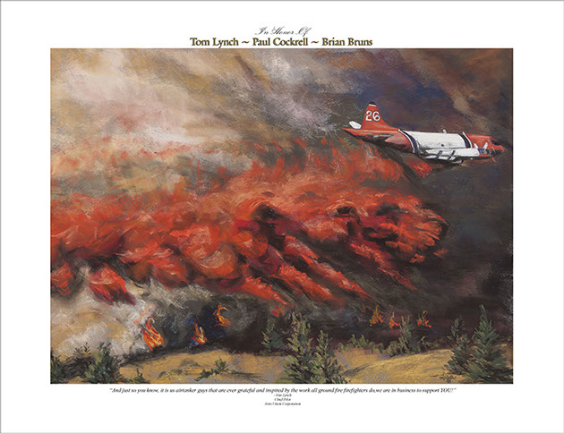 Chief Pilot Tom Lynch, Captain Brian Bruns and Captain Paul Cockrell perished one short month from the day that Chief Pilot Tom Lynch replied to my e-mail inquiry about the T –00. They were on a training mission preparing for the upcoming fire season when the accident occurred. In honor of these brave men, I painted a pastel of the aircraft, the T- 26. A personal presentation was made to Aero Union Corporation as well as the families of the fallen pilots with prints of the T-00 and the T- 26 last October in Chico, California.
